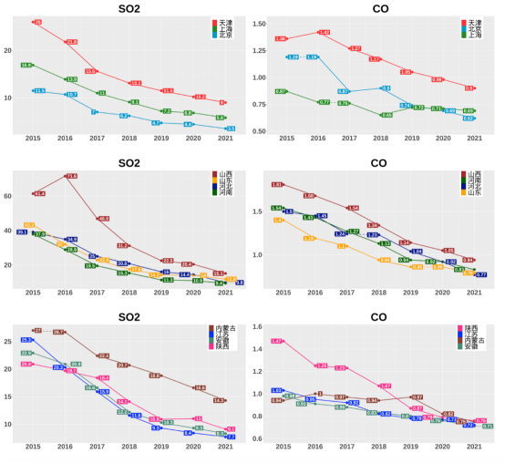 n 分析六种空气常规污染物:PM2.5、PM10、二氧化硫(SO2)、一氧化碳(CO)、二氧化氮(NO2)和臭氧(O3)。