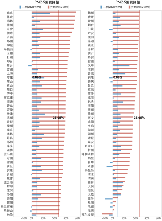 疫情后污染局部反弹:2021年,“3+99”城市的年度平均PM2.5浓度首次全部下降到60微克/立方米以下,其中有31个城市季节年平均浓度超过50微克/立方米。年均PM2.5浓度最高的三个城市分别是临汾(59.9微克/立方米)、安阳(56.7微克/立方米)和渭南(55.9微克/立方米),其中安阳与渭南的PM2.5浓度较上一个季节年有所下降,而临汾却有所上升,城市相对排名也从2020年的28位上升到第一位。相比2020年,PM2.5恶化(降幅为负)城市较多,这可能是受2020年新冠疫情的影响,其中临汾市单年污染增幅为10.3%,污染恶化最严重。截至2021年,有24个城市年均PM2.5浓度低于35微克/立方米,其中黄山、张家口、乌兰察布、威海与上海年均PM2.5浓度最低,低于30微克/立方米。
