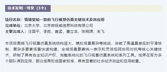 由北京大学计算机学院汪国平、李胜、盖孟作为主要完成人的项目“情境觉知一致的飞行视景仿真关键技术及其应用”荣获2022年度CCF技术发明一等奖!