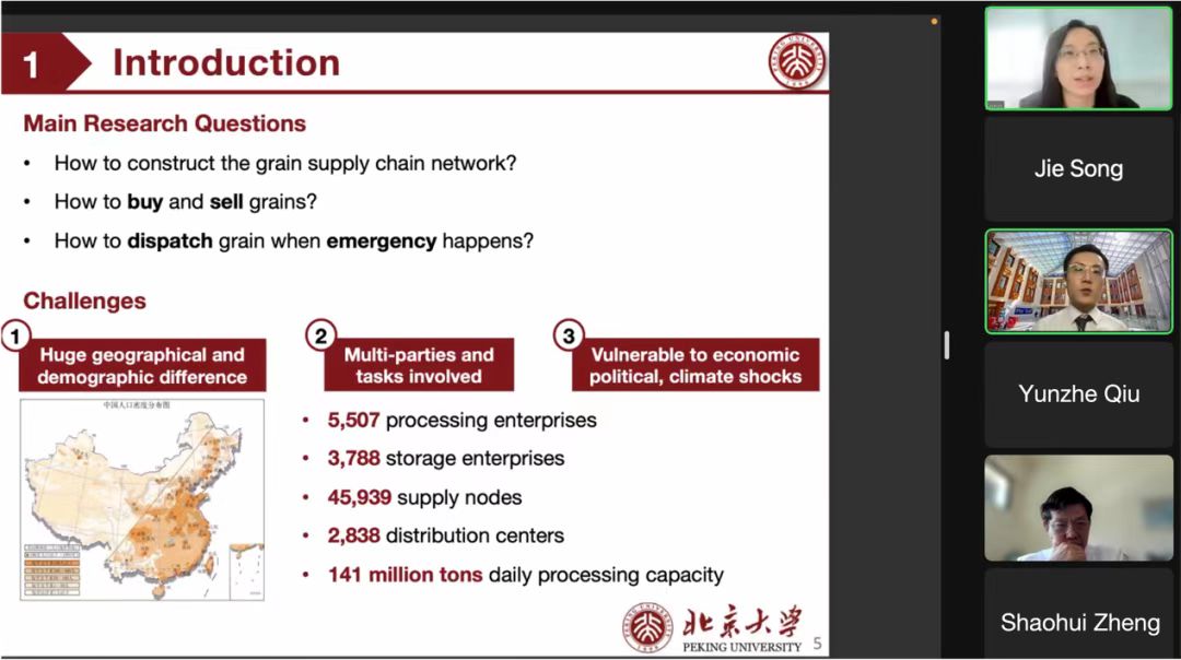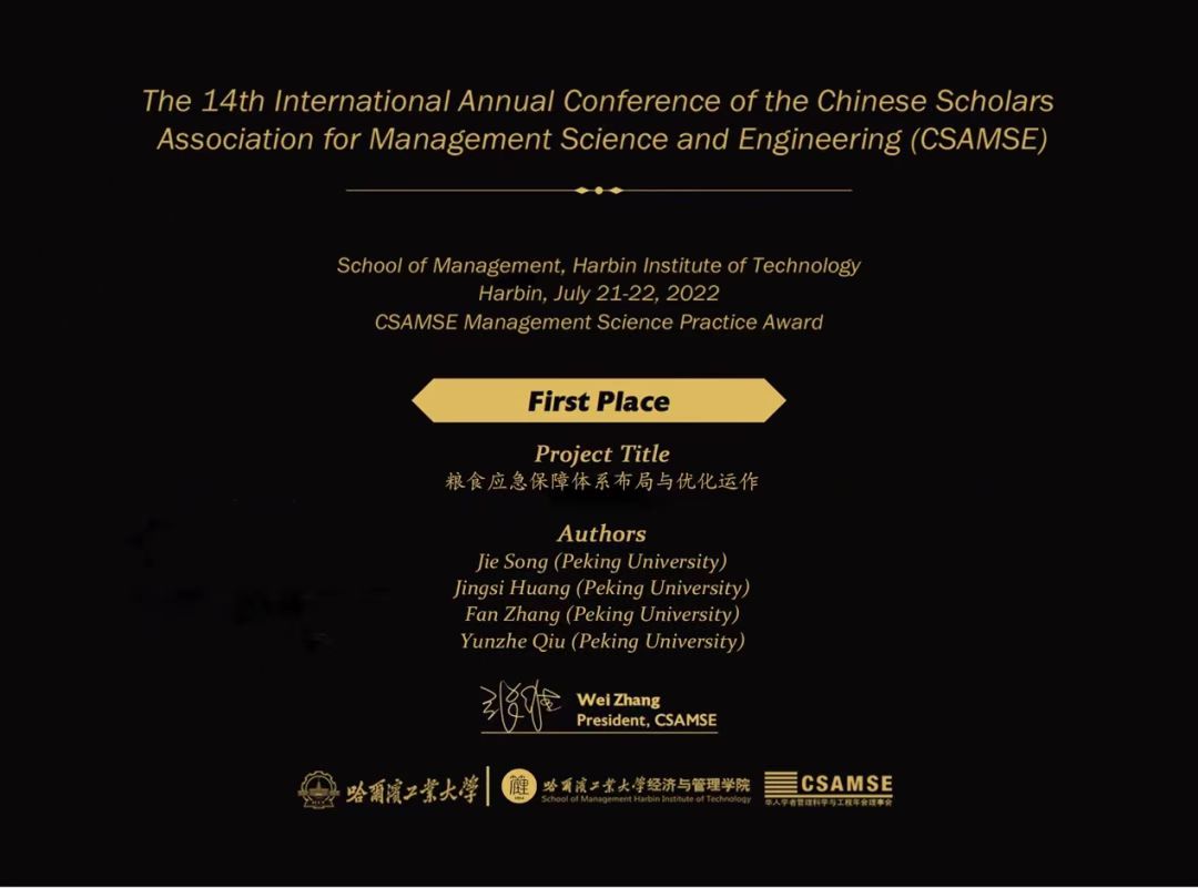 在2022年7月21日至22日召开的第十四次华人学者管理科学与工程(CSAMSE)国际年会中,北京大学工学院工业工程与管理系教授、大数据分析与应用技术国家工程实验室核心成员,北京大学计算与数字经济研究院副院长宋洁及其团队成员黄静思博士、张帆博士、信息管理系邱韫哲助理教授共同申报的“粮食应急保障体系布局与优化运作”项目荣获“最佳管理实践奖”,代表北京大学首次斩获该项殊荣。该奖项旨在表彰应用科学方法解决实际管理问题、提升实践能力的成功案例。“最佳管理实践奖”的评选由函评评选和入围答辩两阶段组成,评审团成员由管理科学与工程领域19名国内外知名学者组成。宋洁教授团队在函评评选阶段脱颖而出入围决赛答辩。