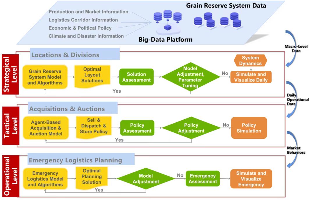 为兼顾系统运作经济性的情况下提升粮食应急保障能力,研究团队针对我国粮食应急保障体系中面临的战略布局、优化运作与应急调度三大问题,通过定性研究与定量研究相结合,采用不同的数据驱动方法进行问题建模求解,以优化系统运营经济性和应急响应能力为目标,充分考虑粮食储藏特性、经济特征和代储企业行为特征。