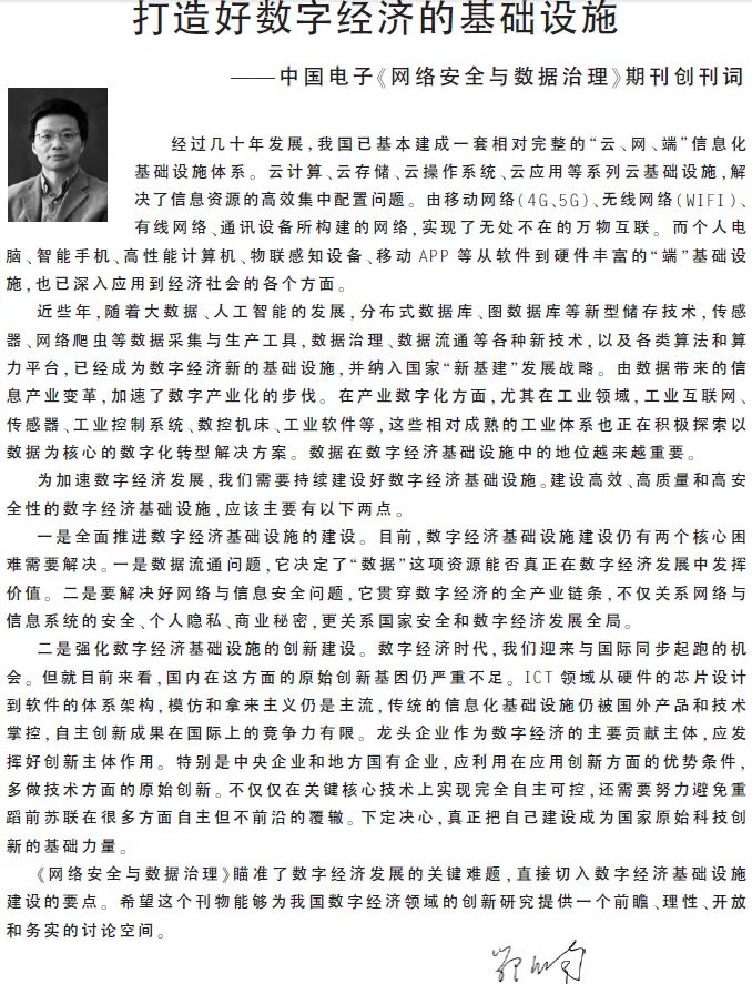 近日,中国科学院院士、大数据分析与应用技术国家工程实验室主任、北京科学智能研究院院长、北京大学国际机器学习研究中心主任鄂维南为《网络安全与数据治理》致创刊词。鄂院士在创刊词中为加速数字经济发展,建设高效、高质量和高安全性的数字经济基础设施,提出两点建议。一是全面推进数字经济基础设施的建设。二是强化数字经济基础设施的创新建设。希望《网络安全与数据治理》能够为我国数字经济领域的创新研究提供一个前瞻、理性、开放和务实的讨论空间。