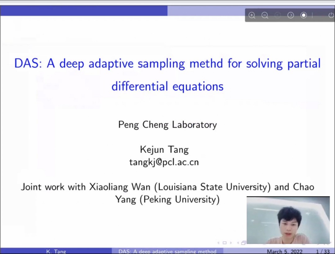 鹏城实验室唐科军在《DAS:A deep adaptive sampling method for solving partial differential equations》报告中介绍了一种求解偏微分方程(PDE)的深度自适应采样(DAS)方法,该方法需要两个深度模型,一个用于逼近偏微分方程的解,另一个用来指导生成训练所需的采样点。DAS整个方法流程包括两个部分:通过最小化训练集中采样点上的残差来求解偏微分方程,然后根据当前残差生成新的训练集以进一步提高当前近似解的精度。与均匀采样的神经网络近似相比,DAS可以显著提高精度,尤其是对于低正则性问题和高维问题。理论分析表明,所提出的DAS方法可以减小误差界,并通过数值实验证明了其有效性。