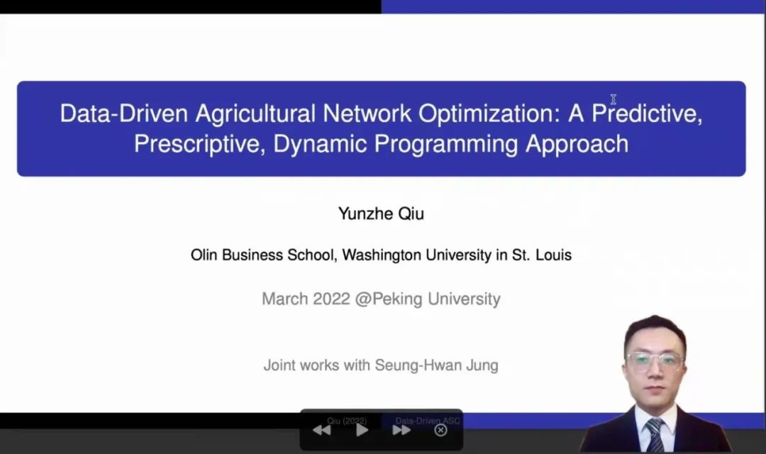 邱韫哲在主题报告《Data-Driven Agriculture Network Optimization: A Predictive Prescriptive Dynamic Programming Approach》中讲到,本研究来自孟山都公司加拿大大豆供应网络优化。在这个供应网络中,公司决定从哪些农场采购以及采购多少,为整个销售季节准备初始库存,并对依次到达经销商的随机订单做出反应。利用数据驱动的预测规范性方法,将动态在线分配问题转化为线性规划,再建立不同模型求解库存部署问题。
