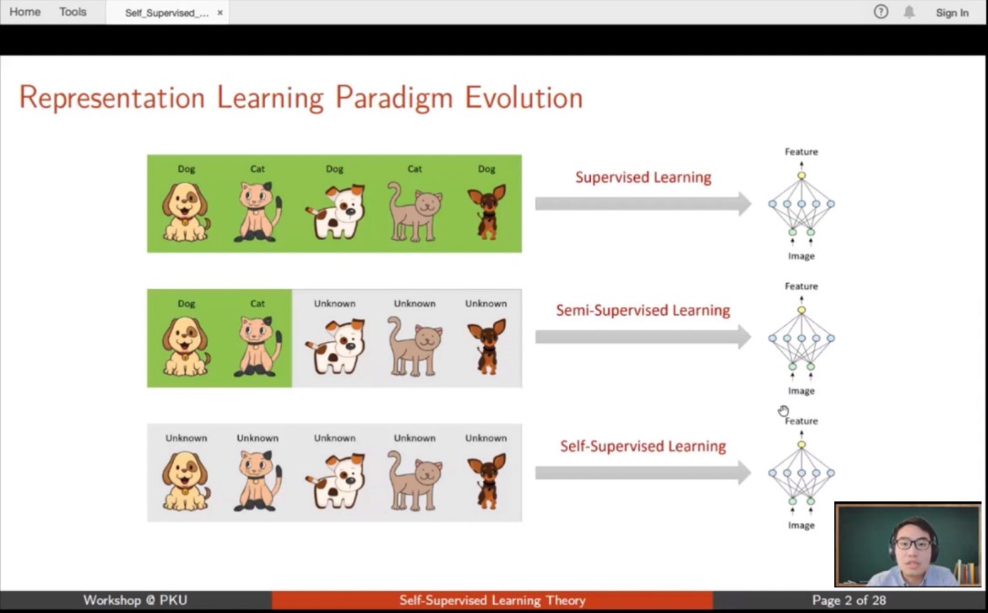 黄维然在报告《自监督学习理论》中讲到,自监督学习是利用大量无标注数据来做表示学习的一种学习范式,因其无需标注数据就能训练出与监督学习相当的性能而获得了广泛的关注。然而,自监督学习的各种算法在下游任务的泛化能力目前还没有很好的理论理解。黄维然从理论上分别分析了基于对比的自监督学习和基于代理的自监督学习,深入讨论了提升对比学习泛化性和提升自监督学习性能的一些关键技术和手段。,并提出了自监督理论未来的三个方向。