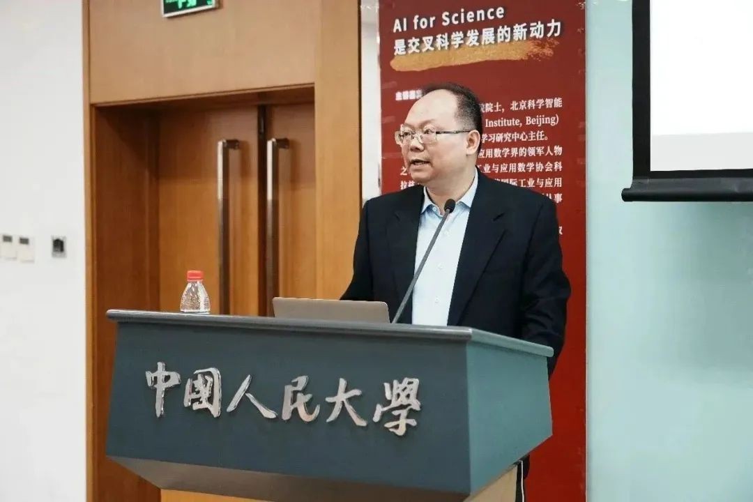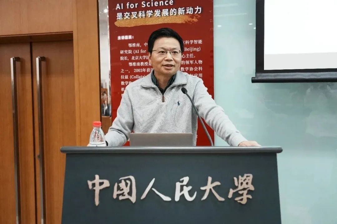 3月17日上午,由中国人民大学交叉科学研究院主办的交叉科学大讲堂第一期在中国人民大学逸夫第二报告厅顺利举办。中国科学院院士、北京大学讲席教授、大数据分析与应用技术国家工程实验室联席主任、北京大学国际机器学习研究中心主任、北京科学智能研究院院长、北京大数据研究院院长鄂维南院士作了以“AI for Science 是交叉科学发展的新动力”为主题的报告。中国人民大学副校长王轶出席活动并致辞。中国人民大学交叉科学研究院院长杨开峰主持。数学学院党委书记柯媛元,交叉科学研究院院长杨东,以及来自全校多个院系的150余名师生参加。