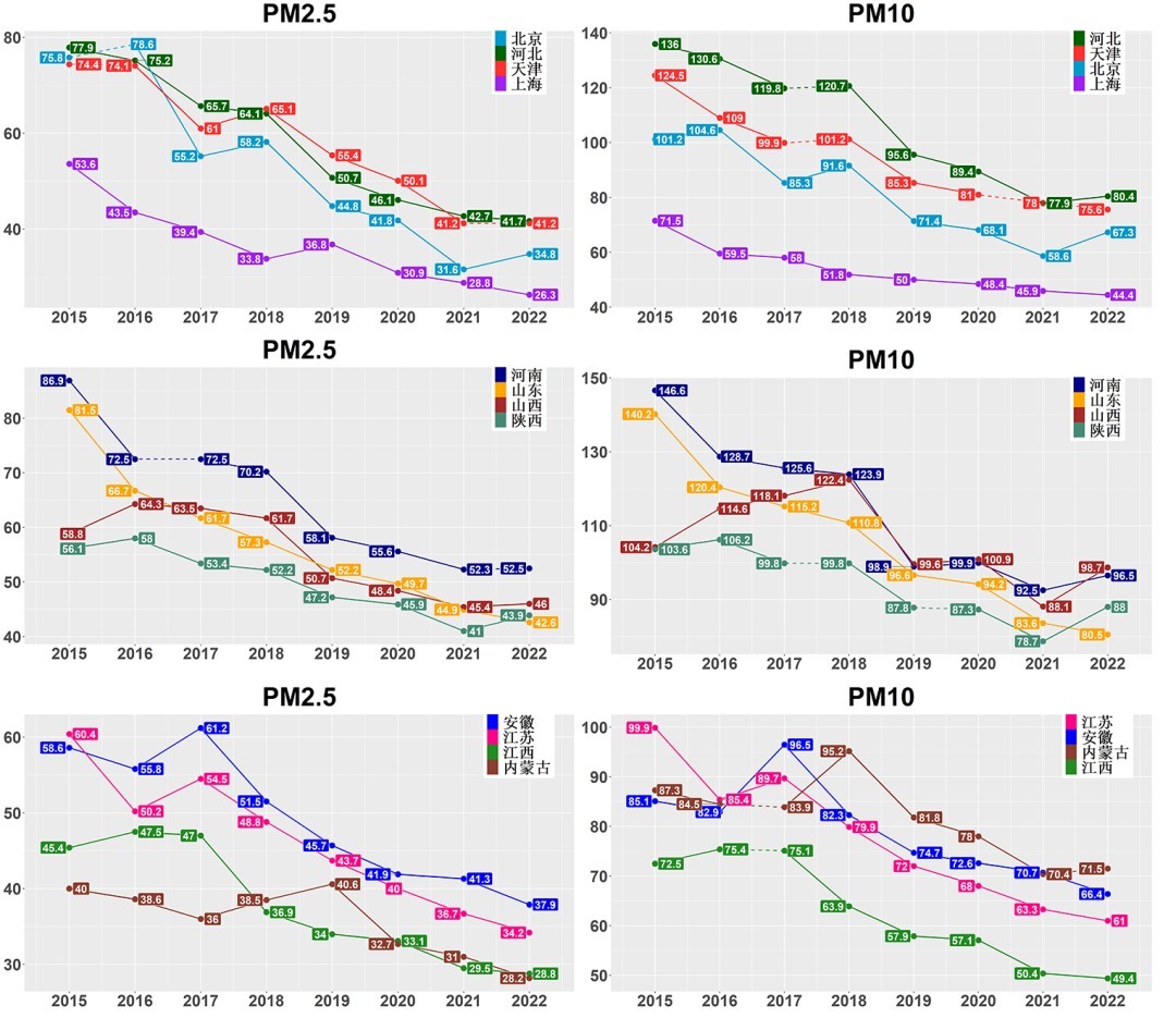图2:九省三市去除气象因素影响后PM2.5和PM10年平均浓度时间序列(微克/立方米)