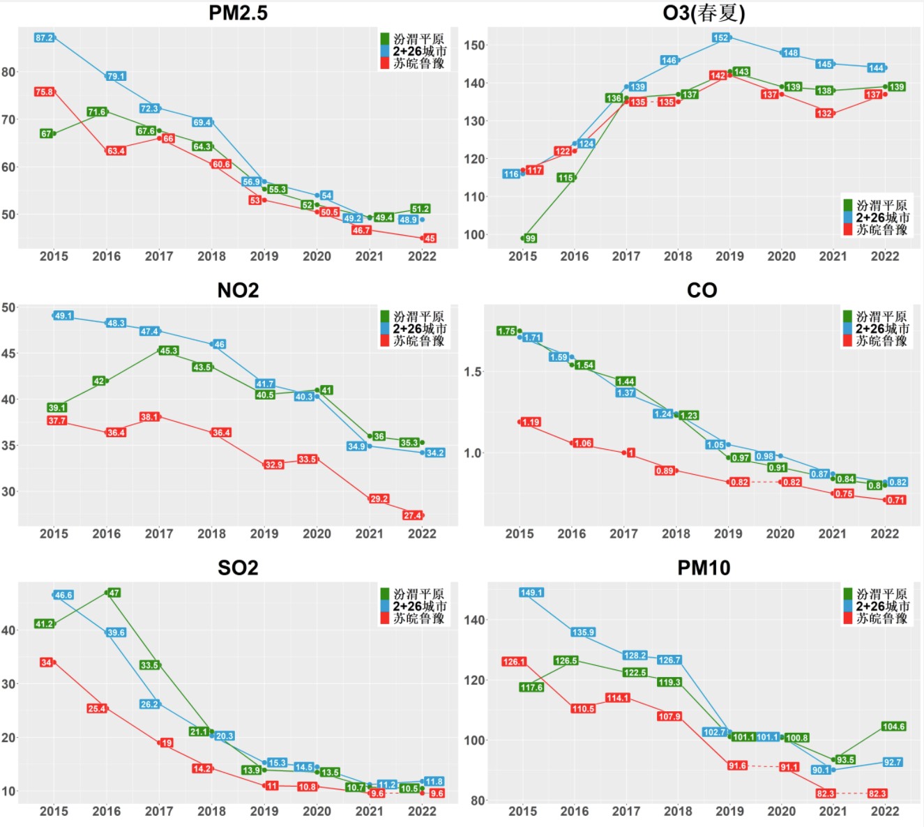 图6:“2+26”城市、汾渭平原和苏皖鲁豫交界地区六种污染物年平均浓度时间序列图