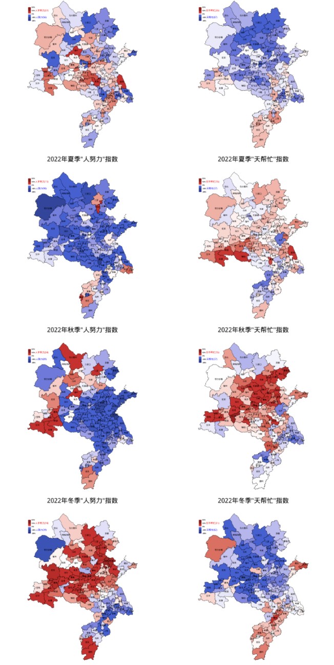 图7:“3+110”城市2021年各季节PM2.5“人努力”和“天帮忙”指数地图