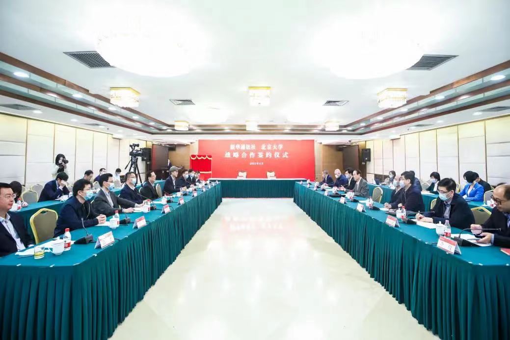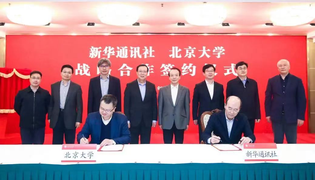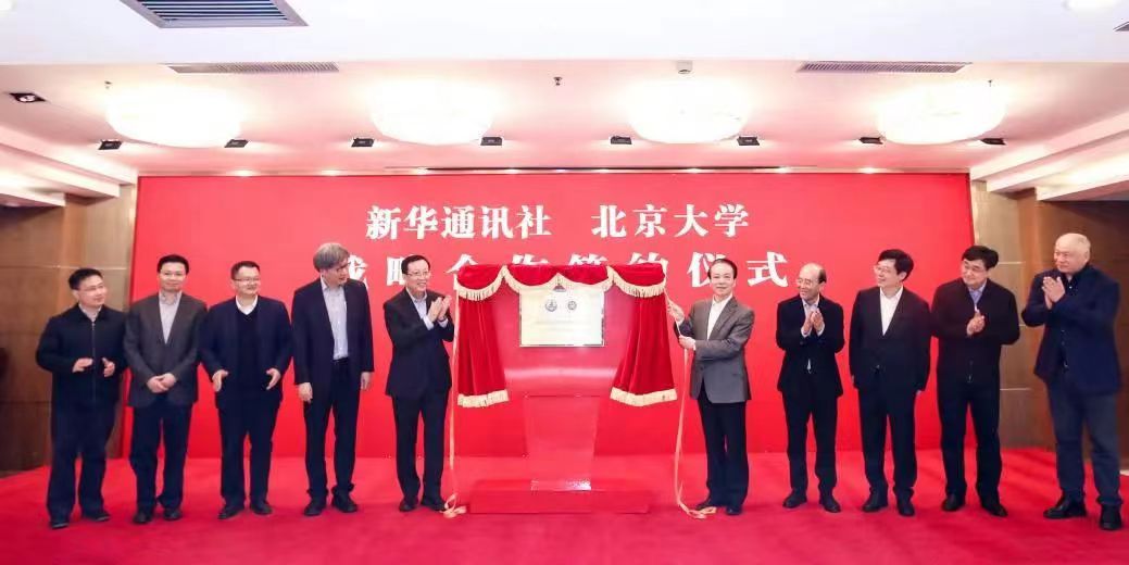 新华社副社长刘思扬和北京大学副校长张平文代表双方签订战略合作协议。何平与郝平共同为“媒体融合生产技术与系统国家重点实验室”揭牌。
