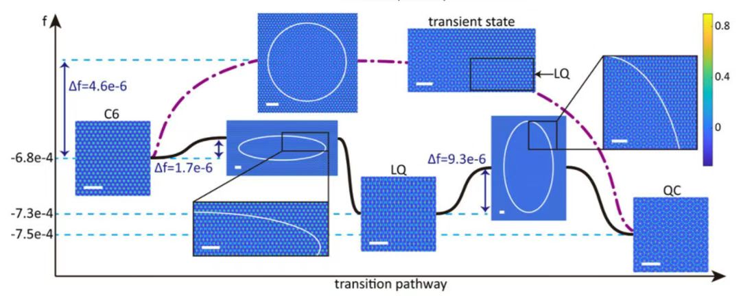 图2:二维六方晶体和十二转准晶之间相变的临界核和转移路径