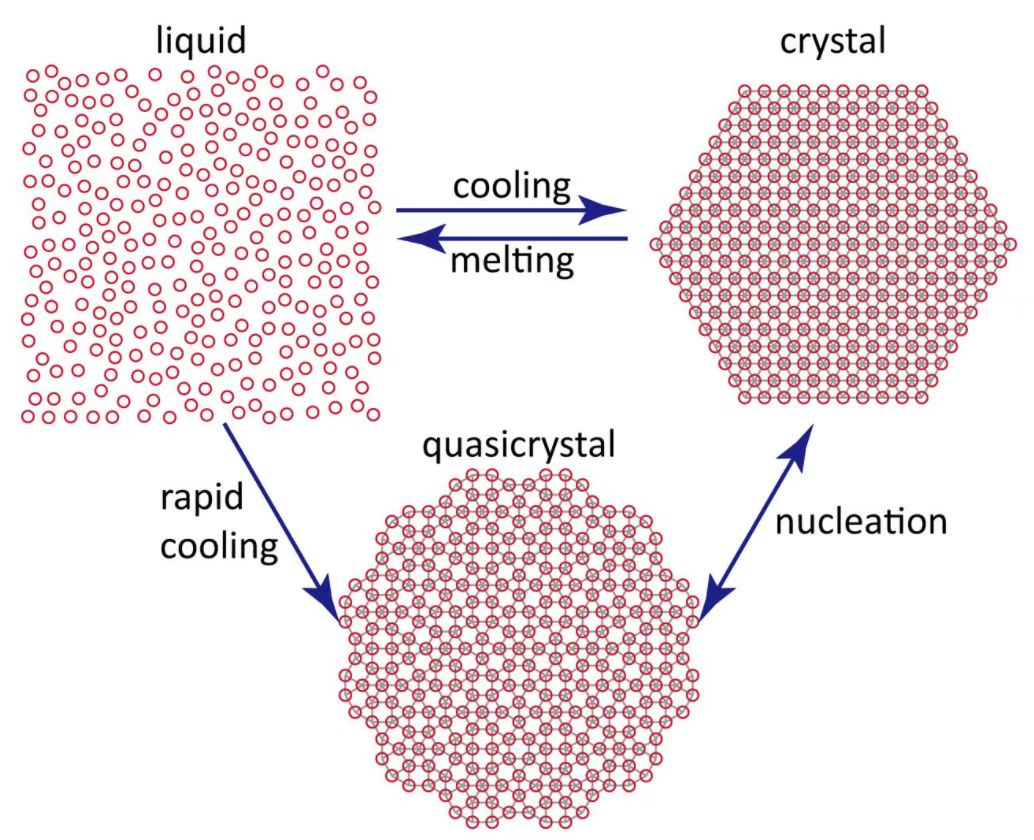 经过几十年的研究,人们得到了多种准晶,也理解了准晶的结构,但是准晶的成核问题,即从周期结构的晶体是否能涌现出准晶,仍然是凝聚态物理学中一个长久以来尚未解决的问题。相比于从无序结构(液体)到有序结构(晶体)的成核与相变,从晶体到准晶的成核过程要困难得多(图1)。这部分困难主要来自于准晶和晶体结构是非公度的,因此它们之间没有明显的外延关系。同时,成核过程是稀有事件,在实验中很难直接观测到,而且计算不稳定的准晶临界核要比计算稳定的准晶结构更加困难。