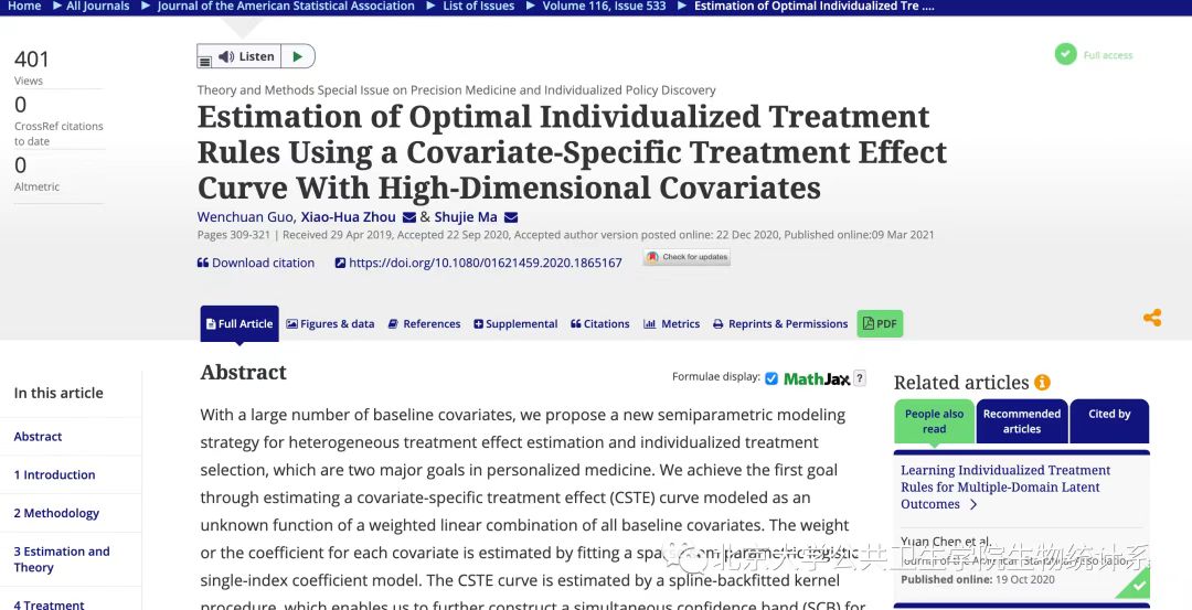 2021年3月9日,北京大学生物统计系教授、北京大学大数据分析与应用技术国家工程实验室数据处理与统计分析中心负责人周晓华与人合作的文章“Estimation of Optimal Individualized Treatment Rules Using a Covariate-Specific Treatment Effect Curve With High-Dimensional Covariates”(《利用含高维协变量的协变量特异治疗效果曲线估计最优个性化治疗规则》)在Journal of American Statistical Association(美国统计学会会刊,JASA)发表。