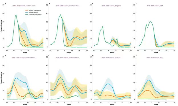 Fig. 2. Estimated influenza activities under the mobility change alone and no intervention as well as the observed activity. (a) Weekly percent positivity in 2019–2020 season for northern China. (b) As (a), but for southern China. (c) As (a), but for England. (d) As (a), but for the United States. (e) As (a), but in 2020–2021. (f) As (e), but for southern China. (g) As (e), but for England. (h) As (e), but for the United States. Shaded area refers to 95%CI.