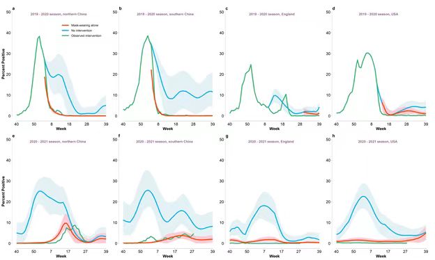 Fig. 1. Estimated influenza activities under the mask-wearing order alone and no intervention as well as the observed activity. (a) Weekly percent positivity in 2019–2020 season for northern China. (b) As (a), but for southern China. (c) As (a), but for England. (d) As (a), but for the United States. (e) As (a), but in 2020–2021. (f) As (e), but for southern China. (g) As (e), but for England. (h) As (e), but for the United States. Shaded area refers to 95%CI.