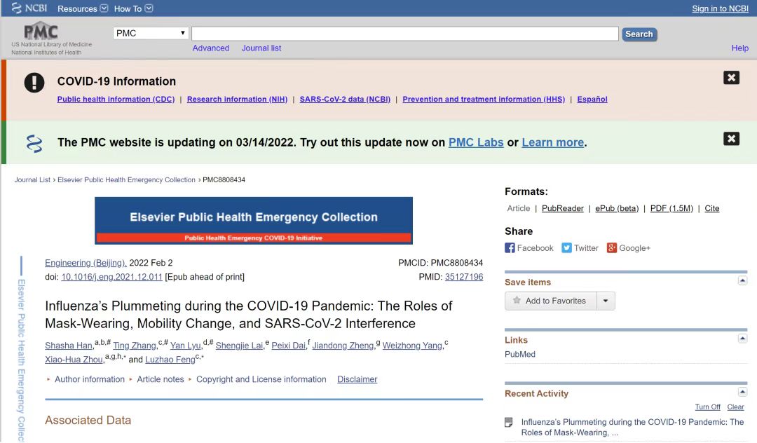 近期,北京大学北京国际数学中心、北京大学大数据分析与应用技术国家工程实验室的周晓华教授团队就非药物干预措施和新冠病毒对抗等在季节性流感传播中的作用在《中国工程院院刊》(Engineering)发表长文(Research Article),题目为(Influenza’s Plummeting during the COVID-19 Pandemic: The Roles of Mask-Wearing, Mobility Change, and SARS-CoV-2 Interference)。