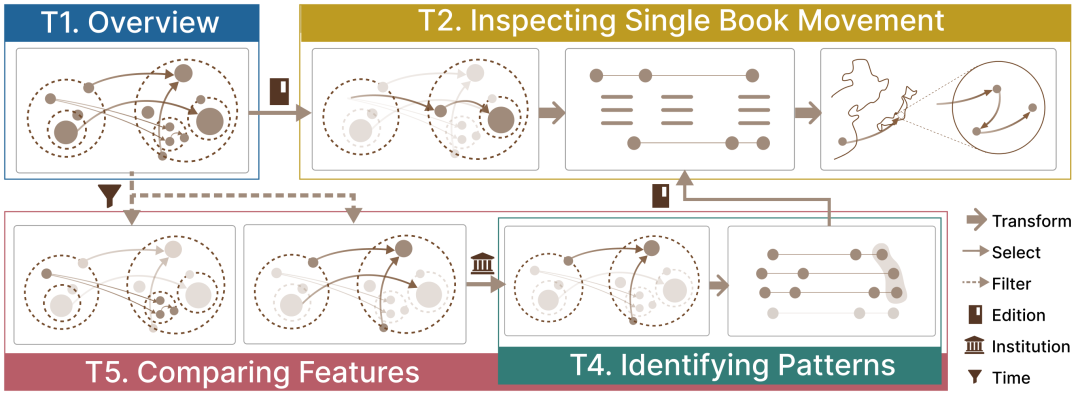 以抽象地图、时间线视图和地理地图为核心构建的 LiberRoad (典藏之路) 可视分析系统支持领域学者完成不同层次的分析任务。如图 4 所示,从抽象地图所提供的概览信息出发,学者可以选择所关注的具体书籍,查看其流传细节;也可以通过筛选历史时期、收藏机构类型等,识别不同的流传模式,如书籍的汇集、分散、机构间书籍的批量移交等,进而比较不同时期的流传特征、不同类型收藏主体在古籍流布中的作用。
