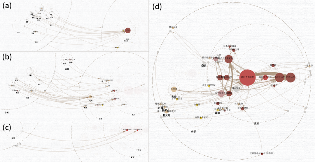 过去一年中,课题组成员详细考证日本宫内厅所藏 64 种宋元善本古籍的流传路径,构建可视分析系统,以支持领域学者从时间、空间、收藏者等多角度分析汉籍流布史。特别针对不确定性的地点信息,提出一种抽象地图可视化的方法,有效揭示汉籍在不同收藏机构间的流传模式。