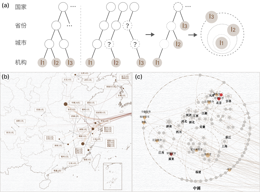 该项研究一大难点是如何表示数据中具有高度不确定性的地点。由于史料缺失,流传路径中的一些地点已难以考据,如仅知位于中国,而省份未详。传统的在地图上绘制轨迹的方法无法避免由于位置位置带来的误解。课题组提出了一种新颖的抽象地图可视化,如图 3a 所示,抽象地图将机构表示为实心圆,按其行政区划层次组织为嵌套的圆形结构,不确定的地点置于已知行政区域边界,通过地理空间、链接关系等约束条件获得优化布局,既避免了在地理地图上绘制不确定地点所带来的误解,又能够最大程度保留已知信息和相关关系。