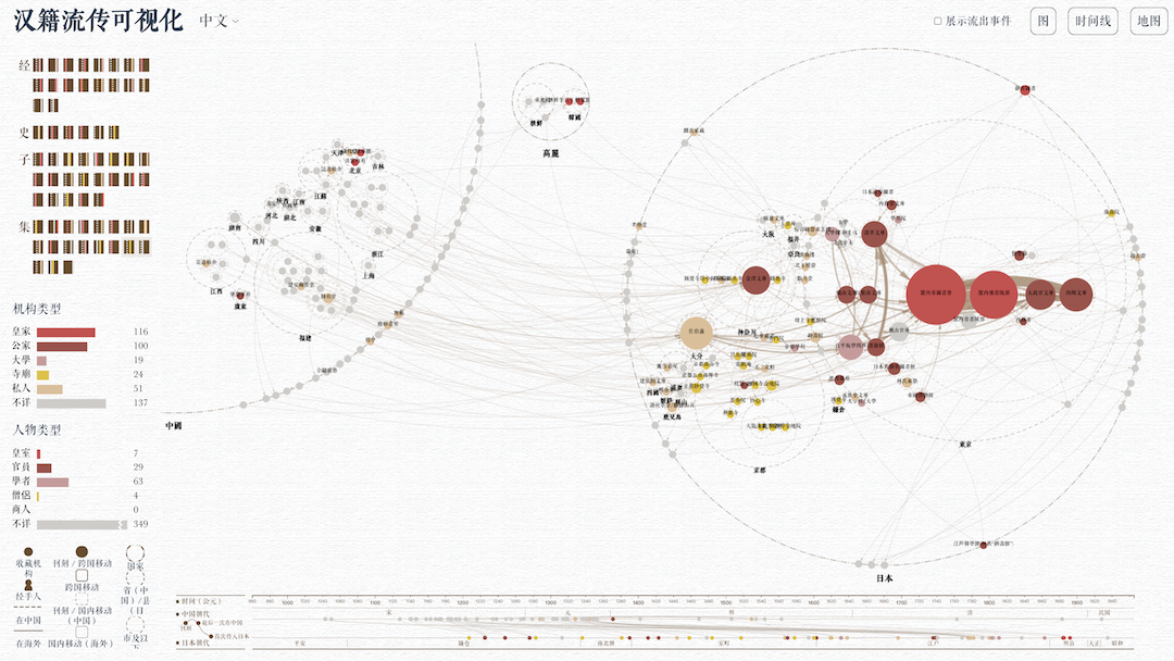 以汉籍交流为中心,延展到与汉籍所关联的学术史、文化史课题,在文史领域已有诸多研究积淀。传统研究限于工具所限,多只能聚焦于具体几种书,对于汉籍流布的全貌则仅有模糊的概念。近年来,信息技术的发展推动了学术研究中数据驱动的第四范式的诞生。可视化作为一种沟通人与数据的技术,使得整体性理解中日两国间的书籍往来成为可能。