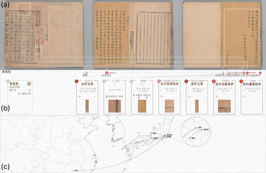 图 1:(a) 南宋刊本《东坡集》内页 (b) 海外流传时间线 (c) 流传轨迹