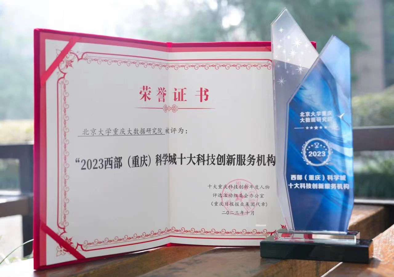 北京大学重庆大数据研究院(以下简称“研究院”)获评“2023西部(重庆)科学城十大科技创新服务机构”。该奖项为今年新增奖项,面向注册登记在西部(重庆)科学城辖区内的企事业单位或其他实体机构,是西部(重庆)科学城科技创新工作优秀成果的一次集中展现。