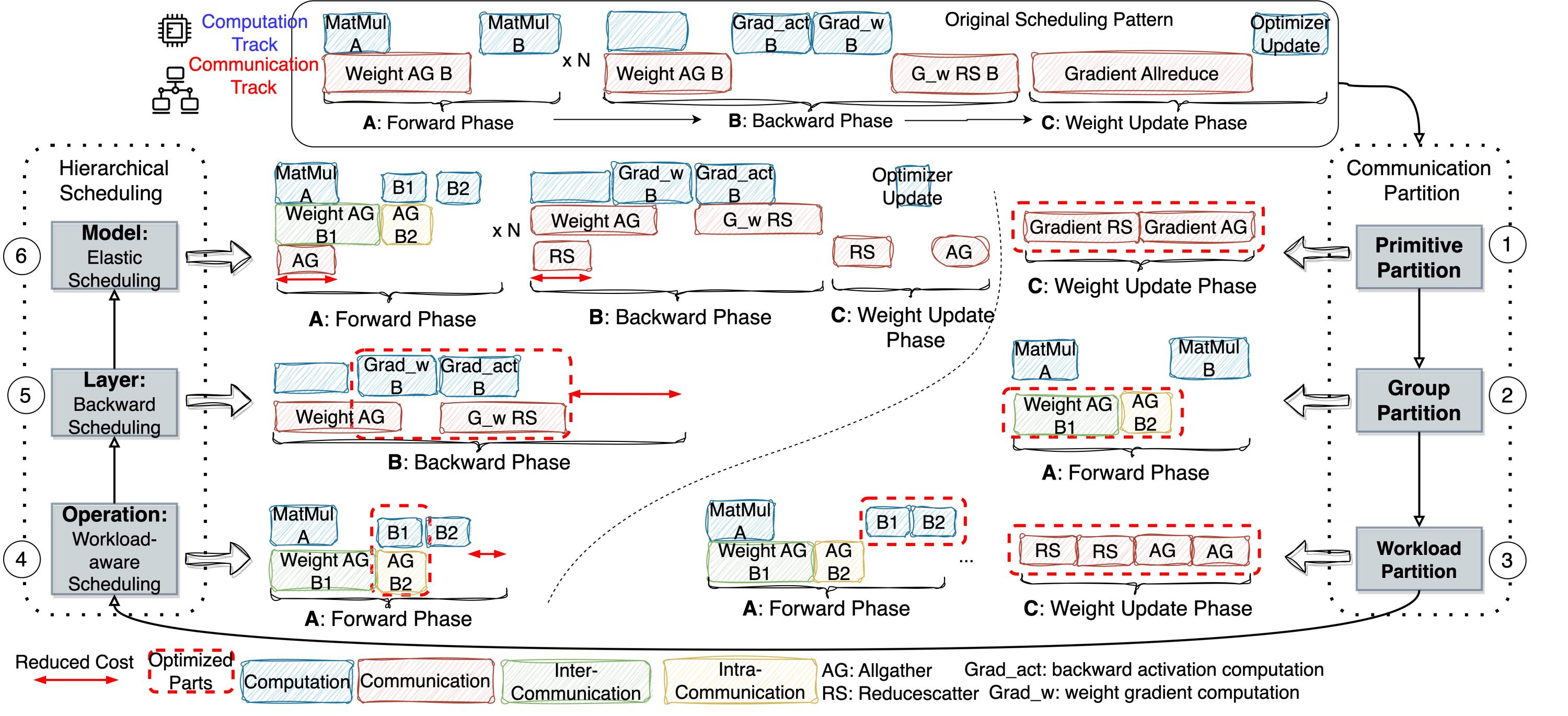 Centauri 流程Centauri是针对大规模模型训练过程中巨大的通信开销,进行通信-计算覆盖优化的框架。Centauri包含通信切分和重叠调度两个部分。针对“通信是负载在设备群上的映射变换”这一核心抽象,文章提出了通信原语(primitive),通信群组(group),通信负载(workload)这三个切分维度。根据这三个维度构造出全面并且可以系统化探索的切分空间。根据模型训练任务的层级特点,在Centauri的调度模块中任务被分成算子级,层级,模型级的不同粒度的调度层。在算子级别针对前向layer内部的通信算子进行贪心的局部调度。在层级别动态地利用反向layer内部自带的算子重叠空间。在模型层级调度micro batch计算以求最大的通信计算重叠。针对多种不同分布式并行配置下,Centauri对于流行大模型可以提升45%的训练性能。