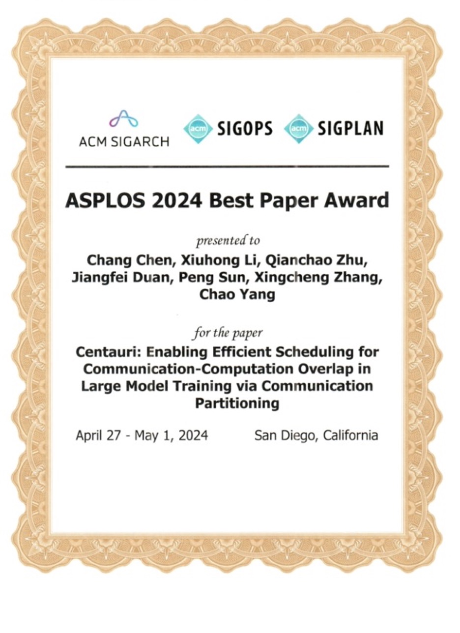 4月27日-5月1日,计算机体系结构顶级会议ACM ASPLOS 2024在美国圣迭戈举办,北京大学数学科学学院教授、大数据分析与应用技术国家工程实验室副主任、北京大学长沙计算与数字经济研究院院长杨超与大数据分析与应用技术国家工程实验室助理研究员李秀红团队在本次会议发表了论文《Centauri: Enabling Efficient Scheduling for Communication-Computation Overlap in Large Model Training via Communication Partitioning》,并荣获会议最佳论文奖(Best Paper Award)。该论文成果第一作者为北京大学前沿交叉学科研究院大数据科学研究中心博士生陈畅,通讯作者为李秀红、杨超。其他作者包括朱钱超(北京大学),段江飞(香港中文大学),孙鹏、张行程(上海人工智能实验室)。