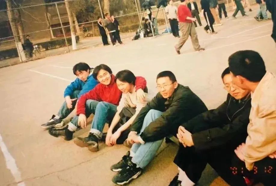 △2001年,董彬(左二)和同学们在二体篮球场