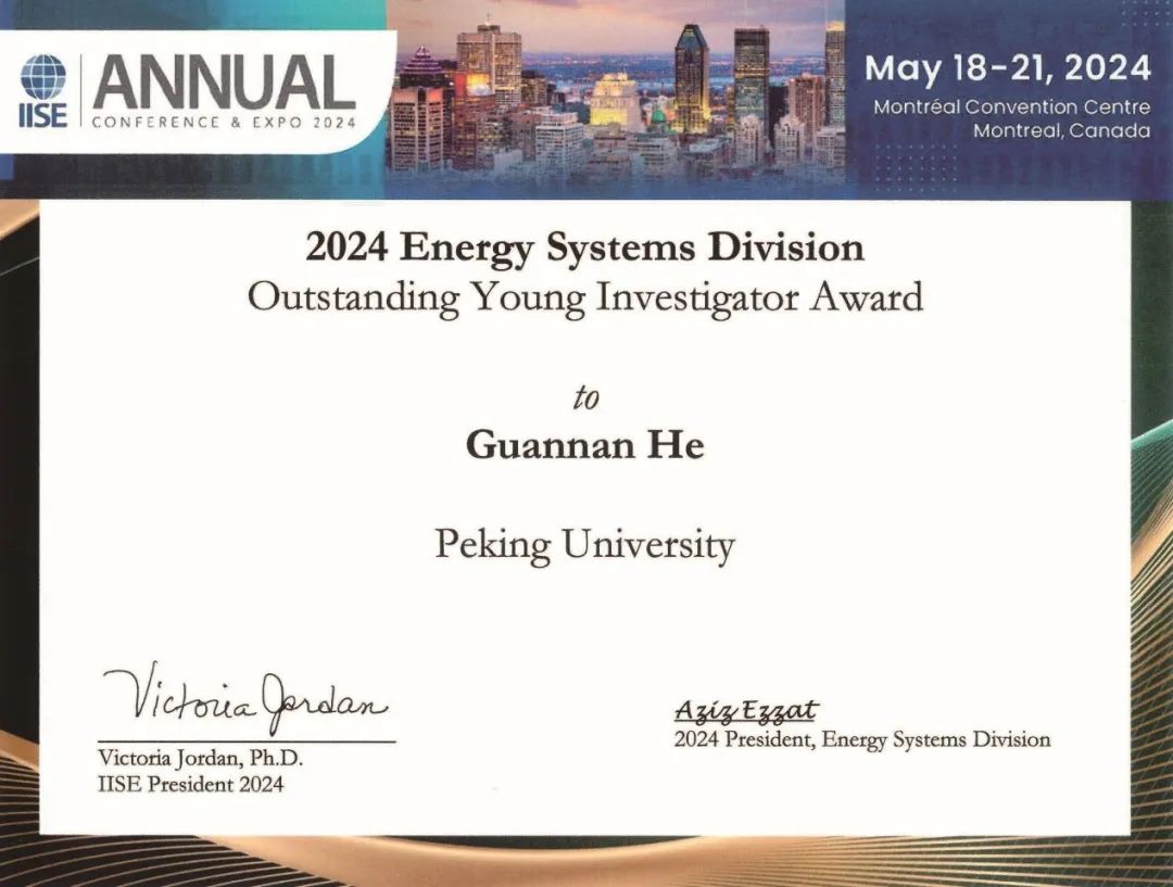 2024年5月18日-21日,国际工业与系统工程学会年会(IISE Annual Conference and Expo 2024)在加拿大蒙特利尔召开。北京大学工学院工业工程与管理系助理教授、大数据分析与应用技术国家工程实验室联聘助理教授何冠楠荣获2024年国际工业与系统工程学会能源系统杰出青年科学家(IISE Energy System Division Outstanding Young Investigator Award),以表彰其在能源系统领域的突出贡献。这是该奖项设立以来首次颁发给在国内工作的学者。