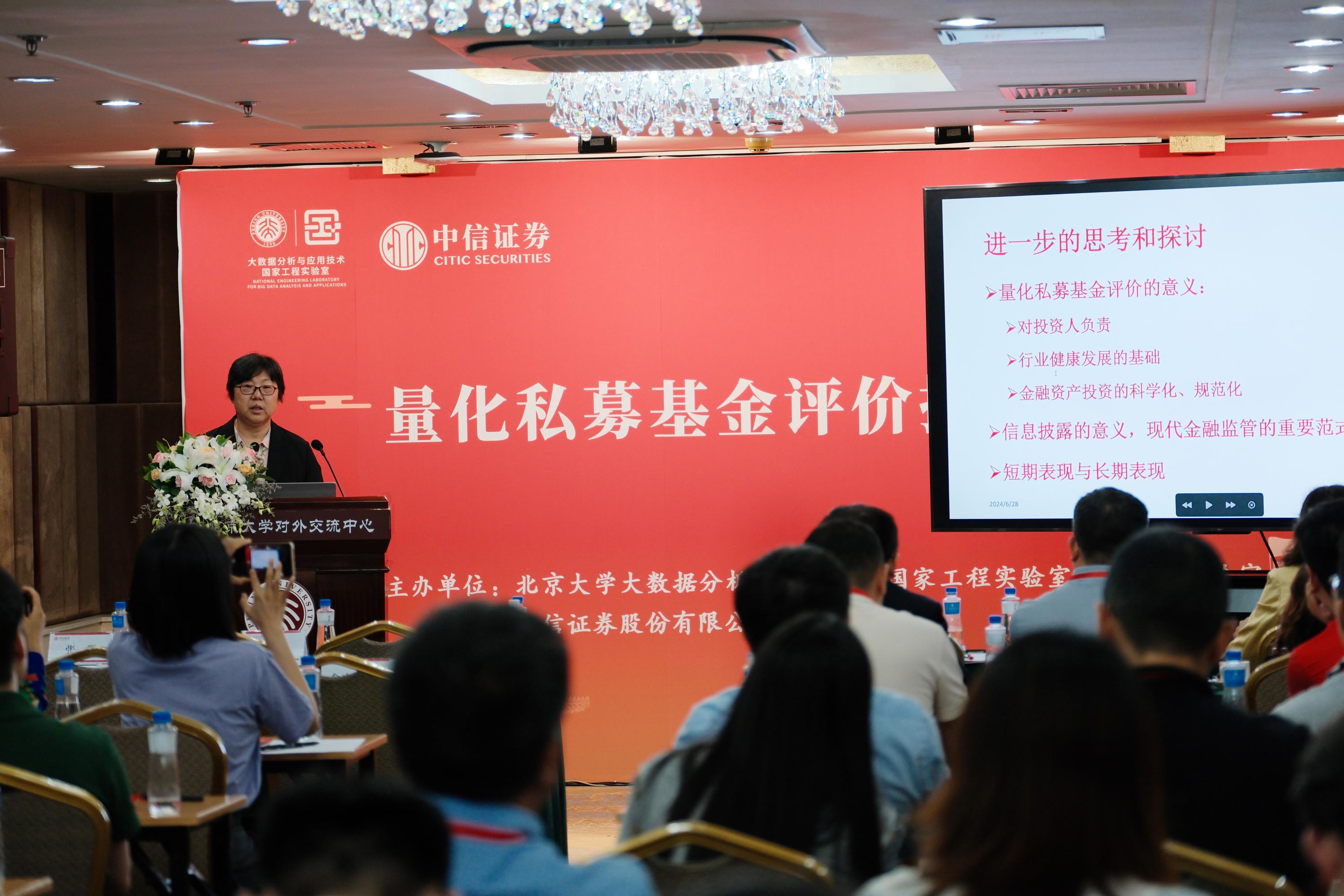 近日,“量化私募基金评价报告”发布会在北京大学英杰交流中心成功举办。发布会由北京大学大数据分析与应用技术国家工程实验室(以下简称“实验室”)量化金融实验室、中信证券北京分公司联合主办。会议由中信证券北京分公司肖秋静主持,北京大学智能学院研究员、实验室常务副主任袁晓如,中信证券党委委员、财富管理党委党委书记史本良分别致辞。北京大学数学科学学院金融系系主任吴岚教授,实验室王冉冉、钱玲、滕宇,中信证券北京分公司总经理田兵、副总经理汪浩波、刘宇、王优、扈文俊、张予钊、王霁阳出席会议。来自资产管理、基金管理、私募基金、量化科技、家族办公室、证券研究所、慈善基金会、大学教育基金会业界人士80余人参加会议。