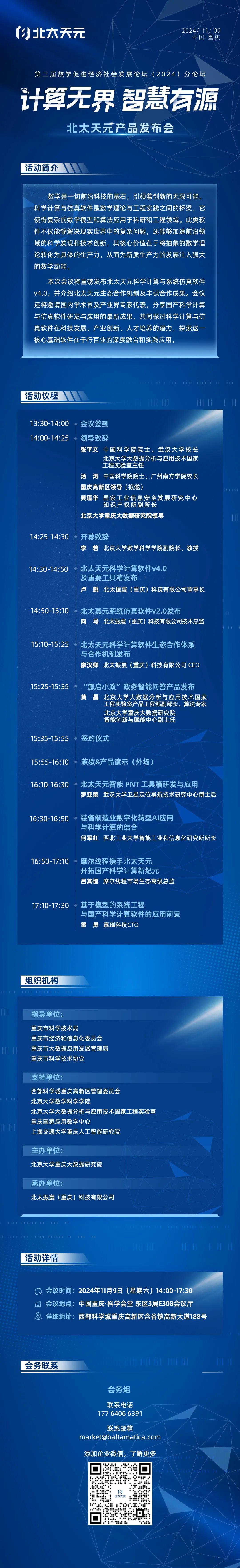 2024(第三届)数学促进经济社会发展论坛由上海交通大学重庆人工智能研究院承办,探究数学在智能制造、大数据、人工智能等前沿科技领域的创新实践,在量子计算、新材料研发、创新药设计等未来前沿科技的应用前景,以及如何作为核心驱动力促进创新型企业的孵化与快速成长等系列问题。