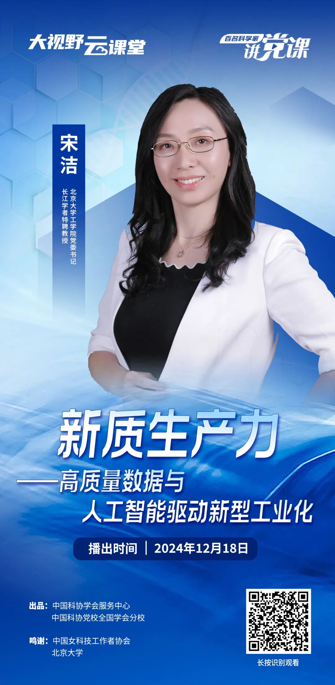 编者按:百名科学家讲党课之“大视野云课堂”是为全国学会打造的引领学习平台,通过邀请院士、专家讲述学科研究进展,展示重大科技创新成果,分享科研经历感悟,弘扬新时代科学家精神,彰显科技工作者不忘初心跟党走、科技报国为人民的价值追求,动员全国学会党组织、广大学会会员为建设科技强国凝聚磅礴力量。今天邀请到北京大学工学院党委书记、教育部长江学者特聘教授,大数据分析与应用技术国家工程实验室核心成员,北京大学长沙计算与数字经济研究院副院长宋洁,她分享的题目是《新质生产力——高质量数据与人工智能驱动新型工业化》。