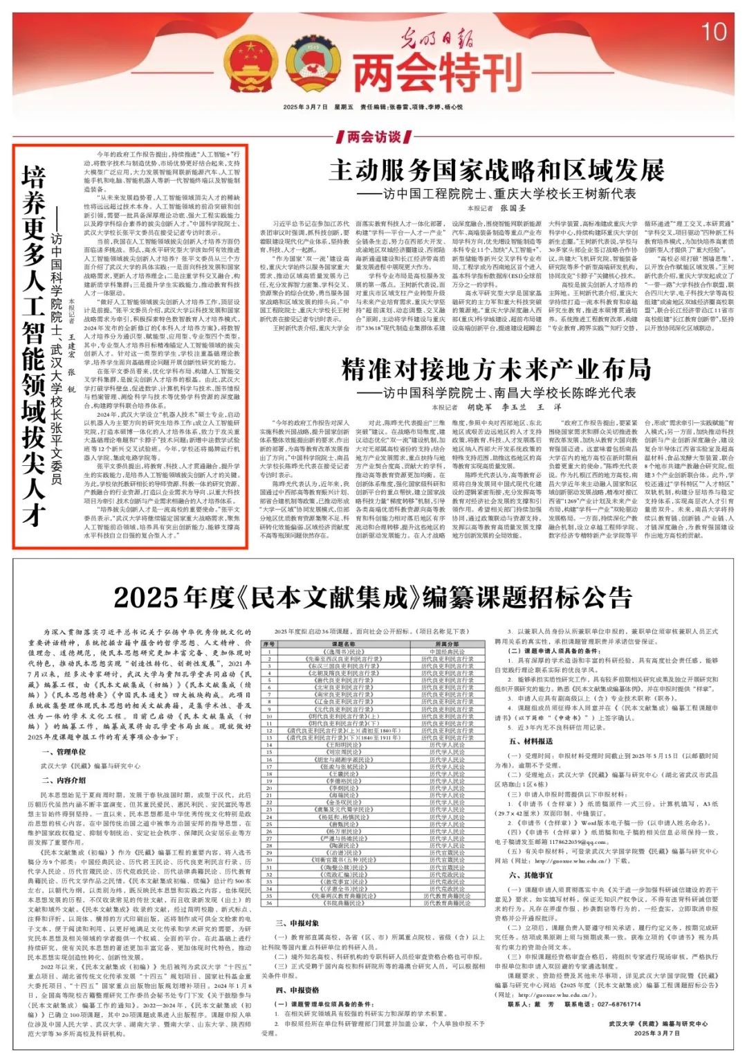 张平文委员提出,将教育、科技、人才贯通融合,提升学生的实践能力,是培养人工智能领域拔尖创新人才的关键。为此,学校依托教研相长的导师资源、科教一体的研究资源、产教融合的行业资源,打造以企业需求为导向、以重大科技项目为牵引、技术创新与产业需求相融合的人才培养体系。“培养拔尖创新人才是一流高校的重要使命。”张平文委员表示,“武汉大学将继续锚定国家重大战略需求,聚焦人工智能前沿领域,培养具有突出创新能力、能够支撑高水平科技自立自强的复合型人才。”