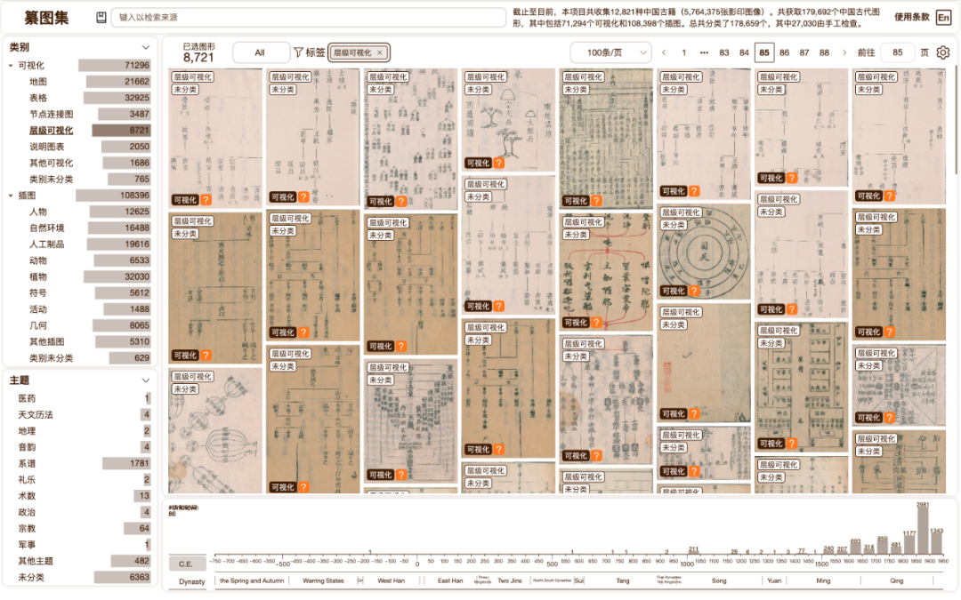 近日,北京大学智能学院研究员、大数据分析与应用技术国家工程实验室常务副主任袁晓如课题组在中国古籍内容的智能探索方面开展跨学科合作探索取得重要进展。研究通过智能自动分类机制,从大量中国古籍中提取可视化图像,建立大规模中国古代可视化集合,系统揭示中国古代通过图形进行知识表示的发展历程,补充完善了可视化学术发展史中的中国部分的空缺。该研究工作近日被领域国际旗舰会议ACM CHI 2025 接受。可视化通过把各种数据转化为可交互的图形图像,帮助人理解认识数据内涵,洞察规律,做出决策。人类通过图像的方式记录描绘事物由来已久,在计算机发明前,可视化的图表也屡见于各种书籍中。人们就会很自然地提问,当前大家熟悉的各种可视化,是在什么时候出现的?在中华文明发展的历史上,是否还有一些不为今人所知的可视化样式?抱着这种好奇心,北京大学袁晓如课题组联合校内智能学院、中国古代史研究中心和牛津大学等机构,系统开展了中国古代可视化发展历史的研究工作。目前已经完成一个包含71,294幅中国古代早期可视化作品的大规模图像数据集《纂图集》(如图1所示)。