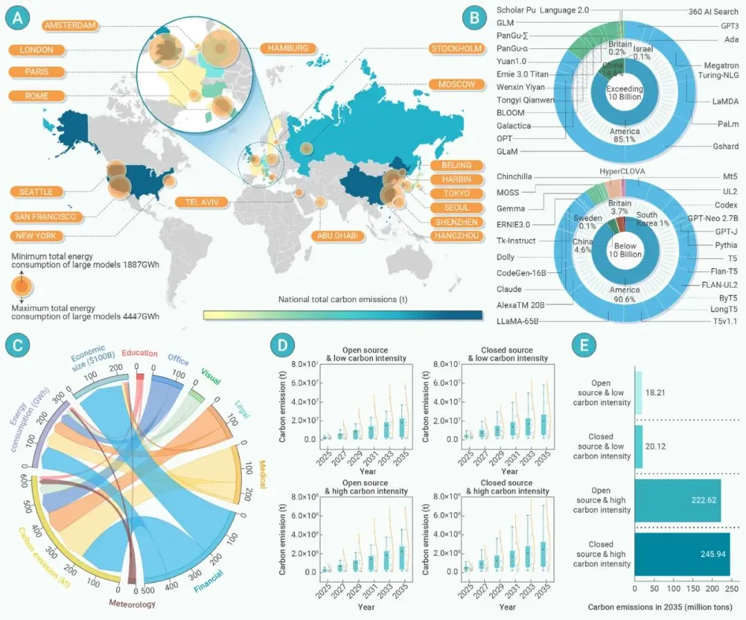 针对全球生成式人工智能爆发式增长与碳中和发展目标之间的矛盾,本文结合全球369个大语言模型,首次系统性地量化其全生命周期碳排放,揭示了全球大语言模型碳排放的区域分布、行业特征以及未来发展路径,为优化人工智能算力布局与开源生态建设提供科学依据。
