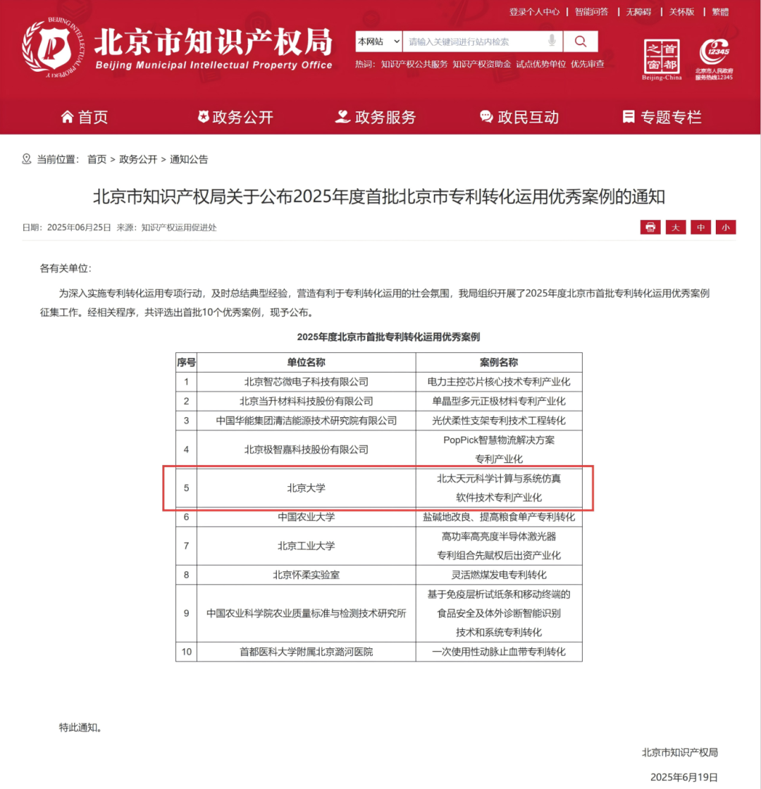 6月25日,北京市知识产权局召开2025年北京市专利转化运用工作推进会并公布“2025年度北京市首批专利转化运用优秀案例”评选结果,公司项目“北太天元科学计算与系统仿真软件技术专利产业化”成功入选首批10个案例。