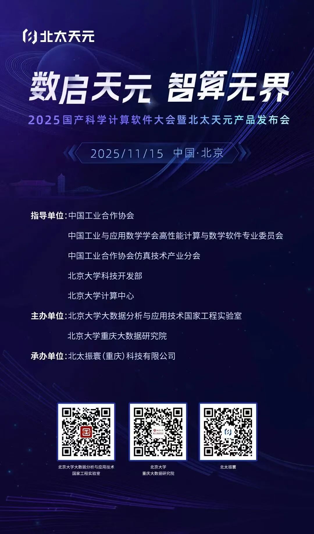 为深入贯彻我国创新驱动发展战略,加快实现高水平科技自立自强,推动国产科学计算软件“理论—技术—产业”全链条创新生态构建,在中国工业合作协会、中国工业与应用数学学会高性能计算与数学软件专业委员会、中国工业合作协会仿真技术产业分会、北京大学科技开发部、北京大学计算中心的共同指导下,由北京大学大数据分析与应用技术国家工程实验室、北京大学重庆大数据研究院联合主办,北太振寰(重庆)科技有限公司承办的 “数启天元,智算未来”——2025国产科学计算软件大会暨北太天元产品发布会,将于2025年11月15日在中国北京市北大博雅国际酒店隆重召开。