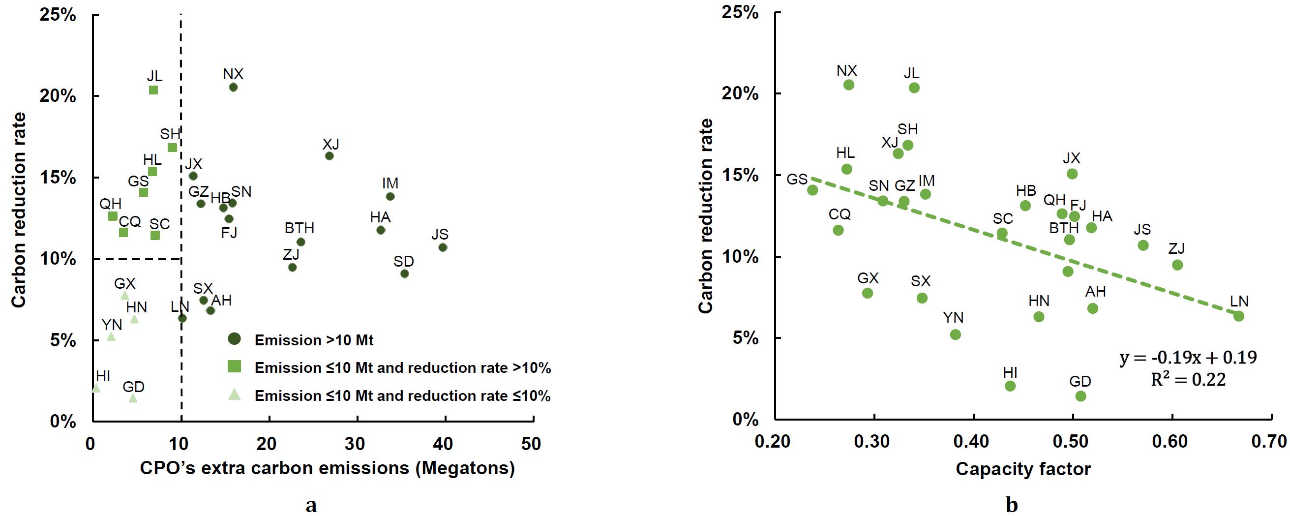 图2 a我国不同省级电力系统碳减排潜力分布;b碳减排潜力与发电资源负荷率的负相关性