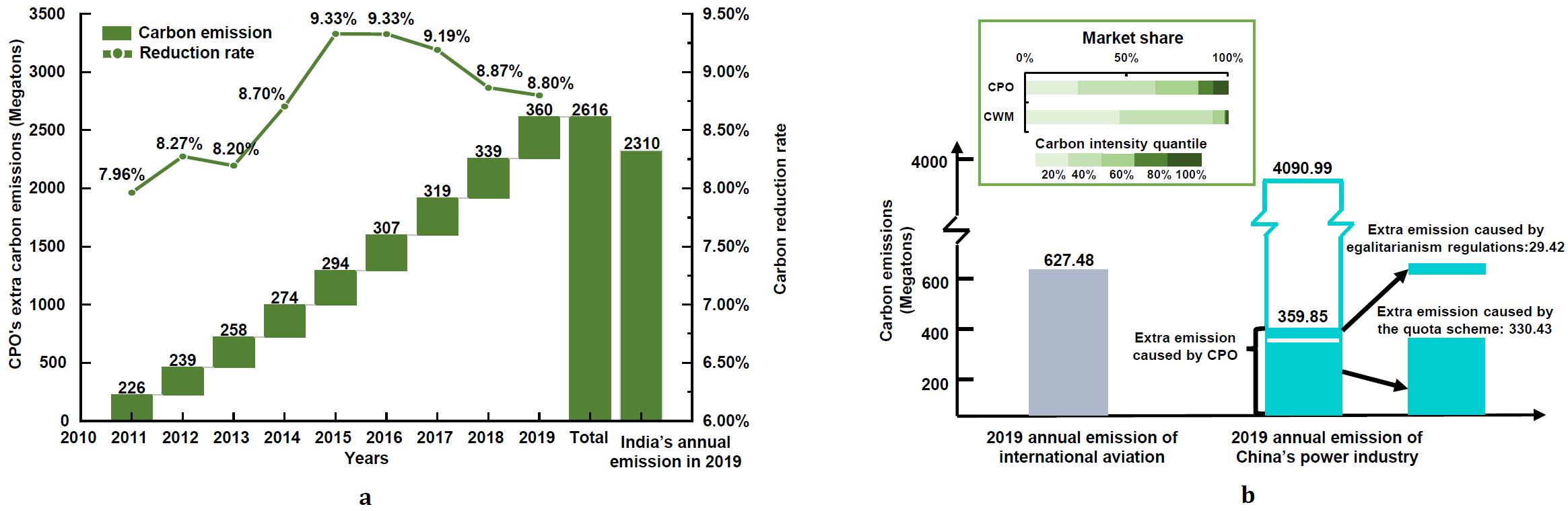 图1 a我国电力制度变迁碳减排潜力;b 2019年不同制度的碳减排潜力贡献度