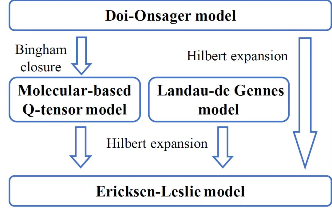论文首先介绍了液晶三类不同层次的数学模型及其联系,即分子模型、张量模型和向量模型。这些模型或者是力学家根据力学原理和本构假设建立的,或者是物理学家基于分子结构运用统计物理平均场理论建立的。以液晶不同模型之间的关系为重点,运用模型约简方法,可以从严格数学意义上或形式上建立不同模型之间联系,并综述了相关的理论分析结果(图一)。