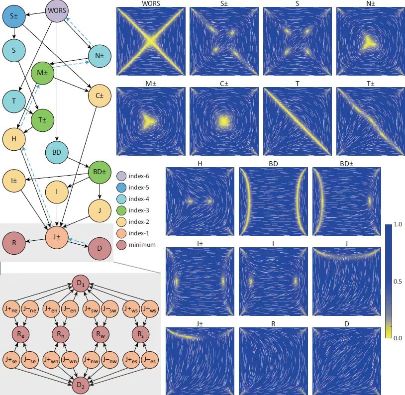 论文接下来介绍了液晶的计算方法,包括计算液晶稳定缺陷的能量极小化方法和梯度流方法,以及液晶流体动力学模型的数值方法,并列举了各类受限在不同几何区域和条件下向列相液晶的缺陷构型。由于液晶通常具有多个有序相,那么如何通过计算找出所有的相以及不同相之间的连接关系?论文先回顾了计算过渡态和转移路径的计算方法,例如寻找最小能量路径的弦方法;然后介绍了近年来提出的解景观概念,及利用鞍点动力学构建解景观的计算方法,同时给出了二维受限区域内向列相液晶完整的解景观(图二)。