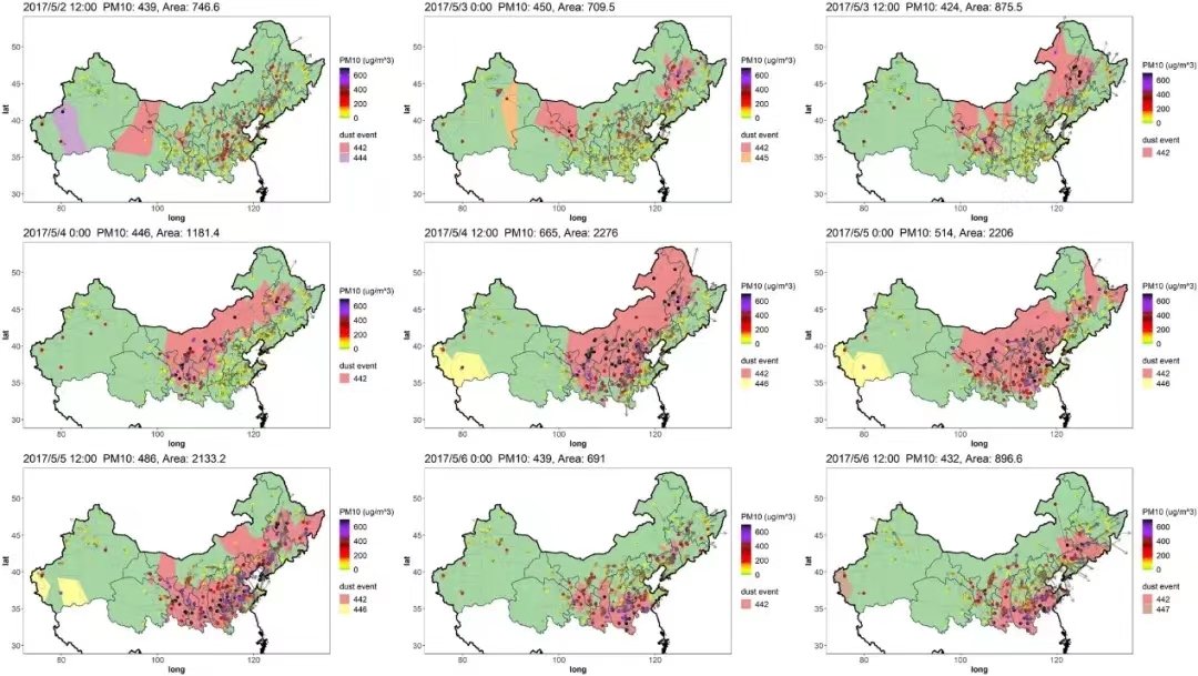 图1 2017年5月2日至6日,一个通过数据与算法识别的大型沙尘过程的演进过程。图中给出12小时间隔的九张快照,红色区域标记了该沙尘过程在各个时刻的影响范围