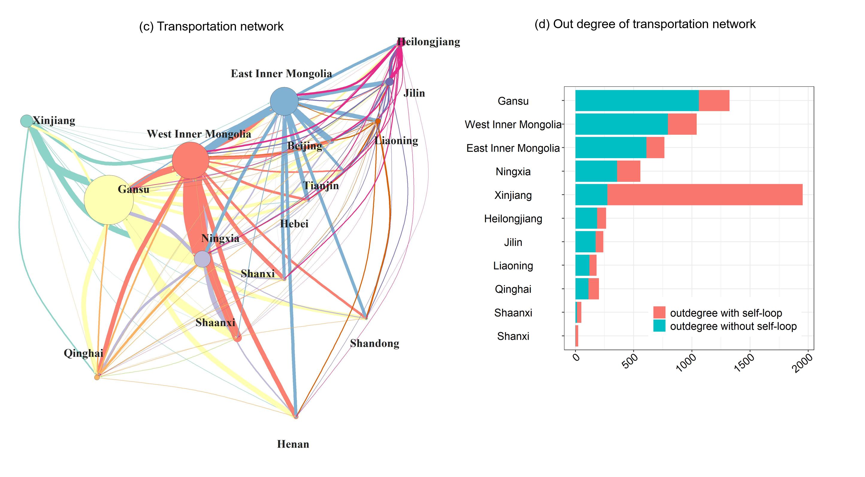 图2左图给出了剔除了自循环后的沙尘传输网络。每个节点代表一个省份,与节点同色的边代表从该节点出发指向其它节点的沙尘传输过程,边的粗细指代传输的累计小时数总数。右图给出了剔除自循环和未剔除自循环的各节点出度(outdegree),新疆的沙尘总量最大但局限在省内
