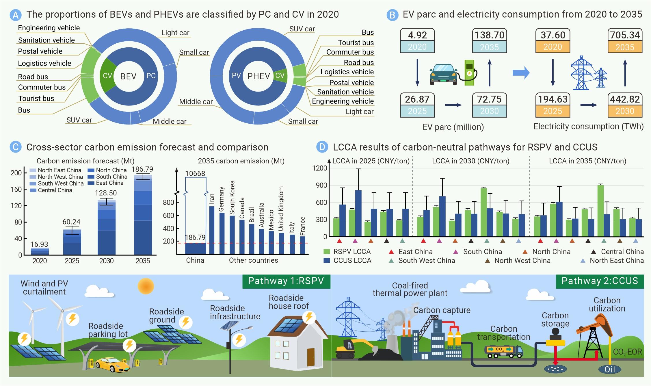 A.2020年我国电动汽车和混合动力电动汽车中的乘用和商用占比;B.2020至2035年我国电动汽车保有量和能耗预测;C.2020至2035年交通向电力系统转移的碳排预测及与其它国家总排放显著性对比;D.2025至2035年我国七大区域面向碳中和的CCUS与路侧光伏平准化碳减排成本.