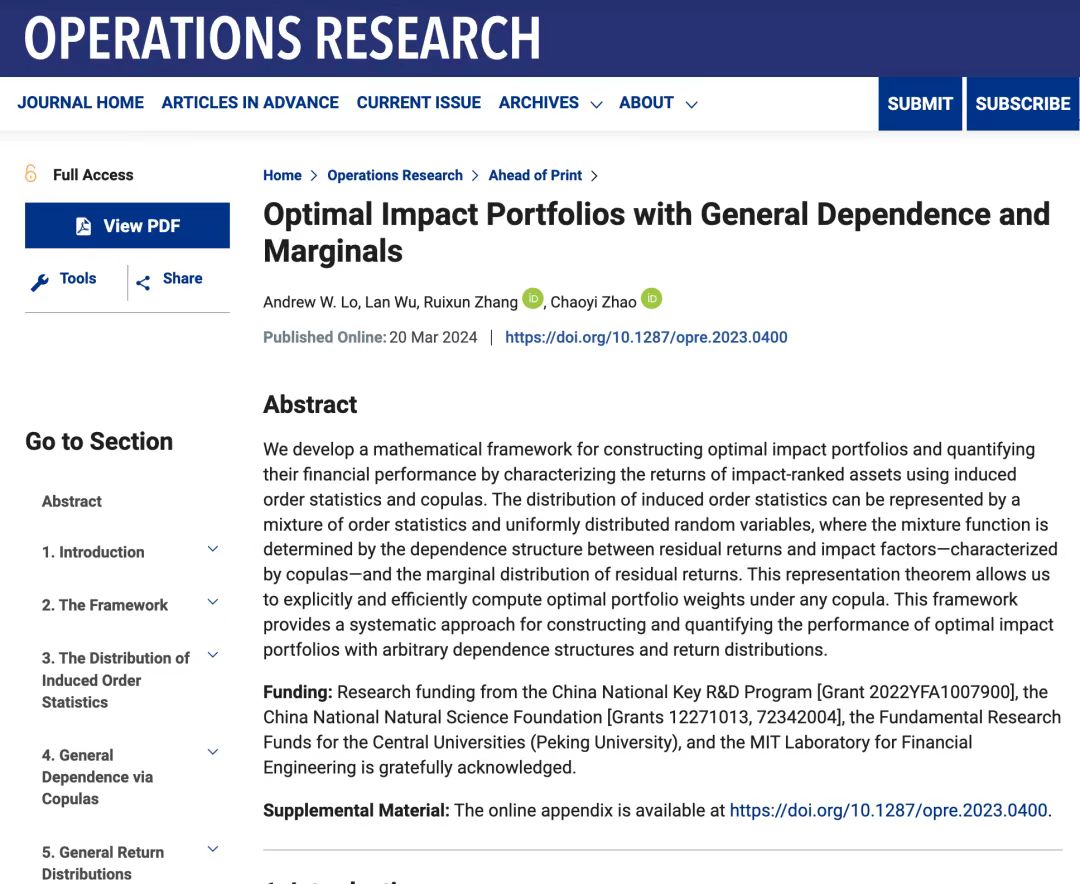 近日,由北京大学数学科学学院、统计科学中心教授吴岚,北京大学数学科学学院、统计科学中心助理教授/研究员、大数据分析与应用技术国家工程实验室联聘助理教授张瑞勋,北京大学数学科学学院金融数学系统计学专业2019级博士研究生赵朝熠和麻省理工学院斯隆管理学院教授Andrew W. Lo合作的论文“Optimal Impact Portfolios with General Dependence andMarginals”在国际顶尖学术期刊Operations Research在线发表。Operations Research是美国运筹学与管理科学研究协会(INFORMS)出版的旗舰期刊,创办于1952年,是运筹和金融工程领域国际公认的顶尖学术期刊。