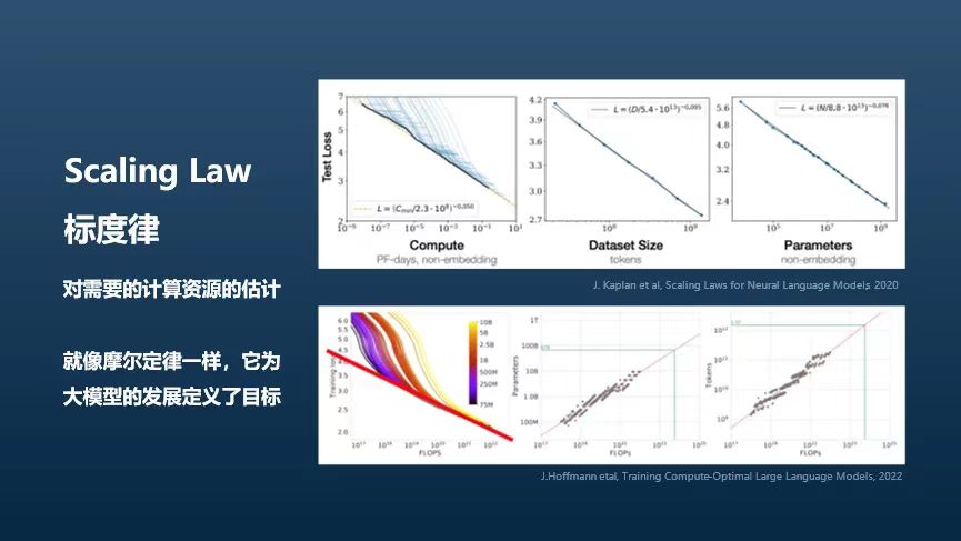 其次,我们需要考虑模型的通用性,即模型必须能够解决所有下游任务。Open AI的“预测下一个词”模型不仅具有通用性,还是一种生成模型,这与BERT有显著不同。更重要的是,这种模型具有标度律,这为我们提供了两个重要的好处。