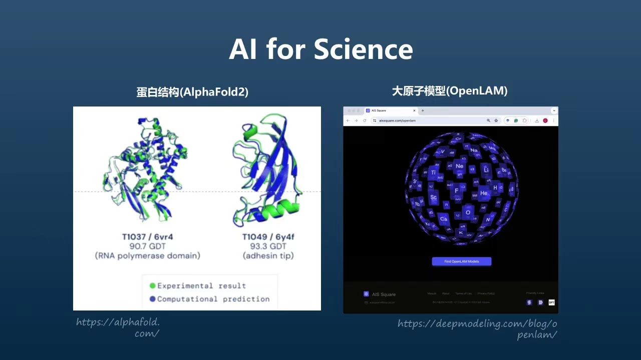 谈到AI for Science,AlphaFold2用非常简洁优雅的办法,把生命科学中一个非常基础的问题(预测蛋白质结构)彻底解决了,这是我们没有预料到的。我们正在做的OpenLAM,目的是发展一个通用的大原子模型。