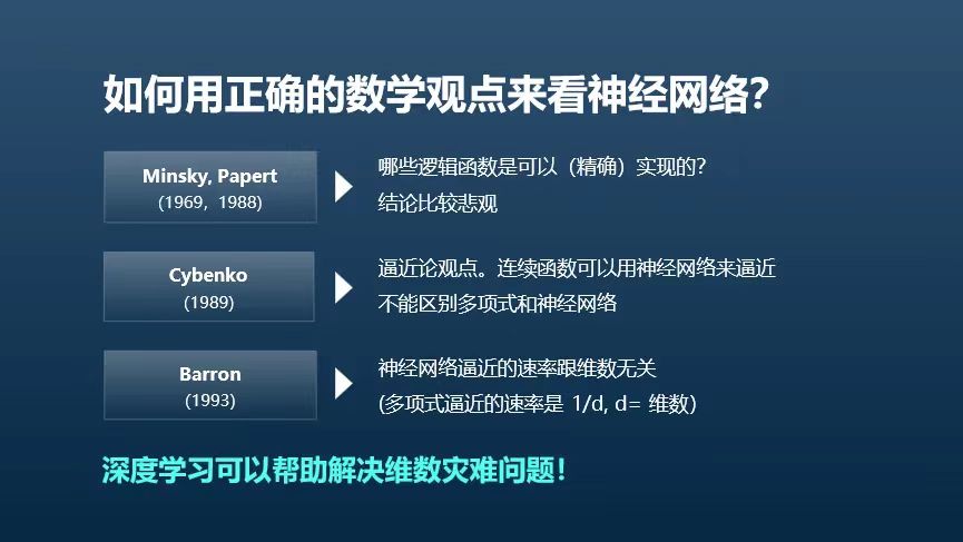 进入80年代末,Cybenko定理的提出为神经网络领域带来了新的希望。这个定理证明了任何连续函数都可以用神经网络来逼近,许多人也将其视为神经网络最基本的数学定理。但这个观点也是错误的,数学家都知道,连续函数也可以用多项式来逼近,这被称为魏尔斯特拉斯逼近定理。尽管我们“玩转”多项式这么多年,但对于刚才提到的高维问题,多项式仍然有局限。Cybenko定理虽然正确,但并未明确指出神经网络与传统方法(如多项式)之间的本质区别。