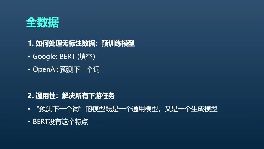 在探讨如何充分利用所有数据的过程中,我们首先需要解决的关键问题是如何有效处理无标注数据。例如,对于医学影像数据,高质量的标注往往需要专业医生的参与,这在实际操作中难以实现。因此,大多数数据实际上是未标注的。为了解决这一问题,预训练模型成为了关键技术。目前,BERT和Open AI的预训练模型是两个主要的解决方案。BERT通过“填空”的方式进行预训练,而Open AI则通过“预测下一个词”的方式。